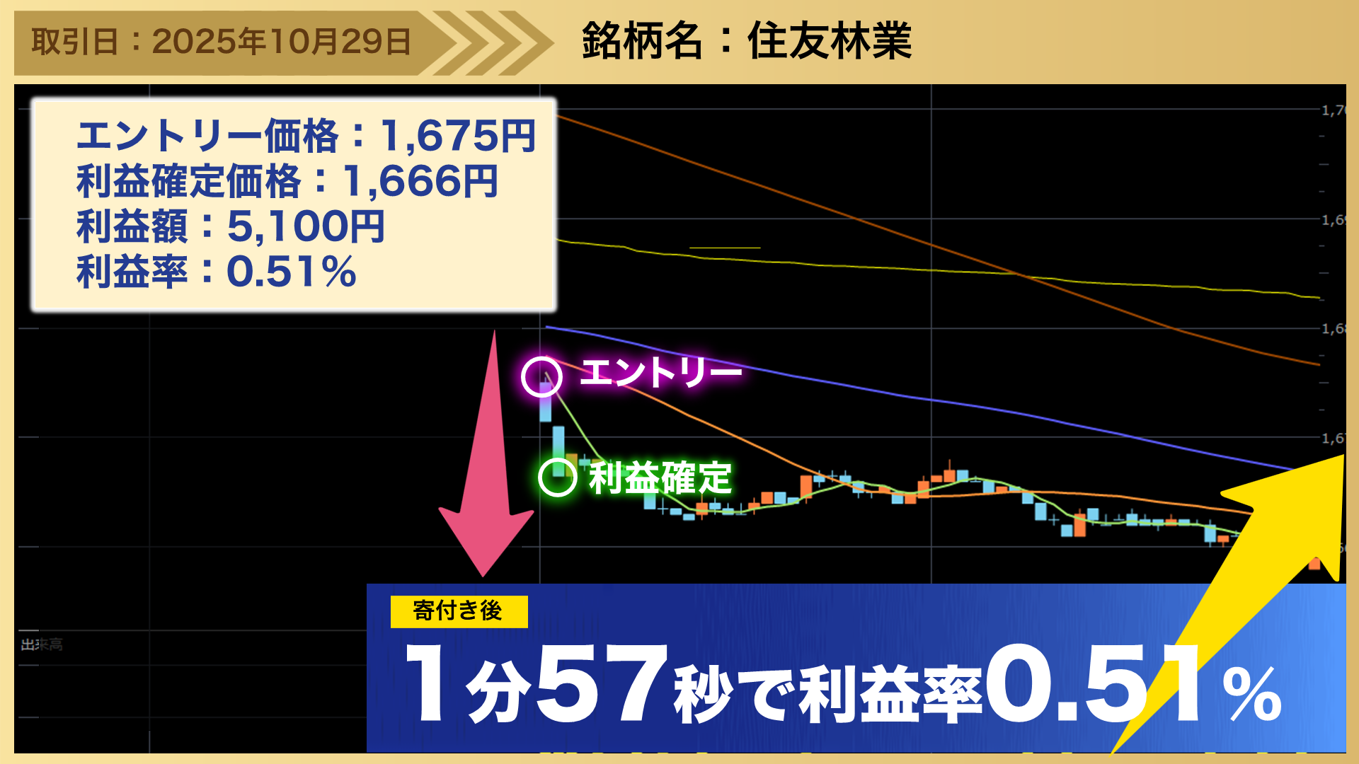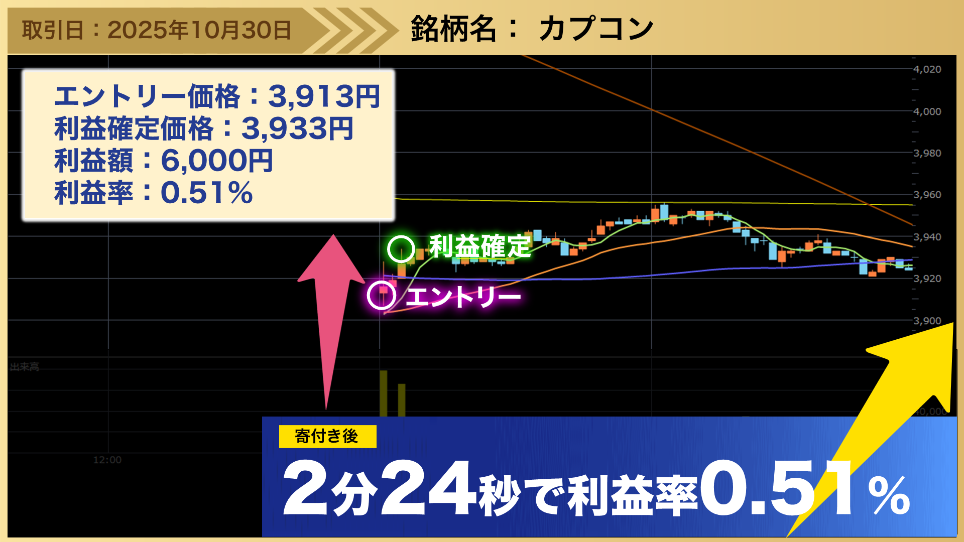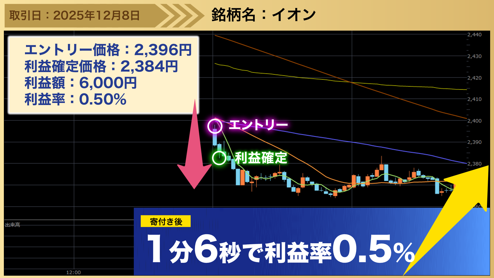 後場の居合抜き1分トレードのトレード事例として、