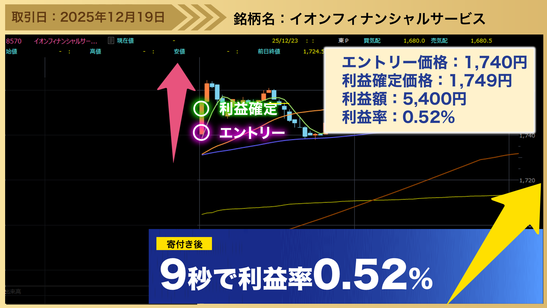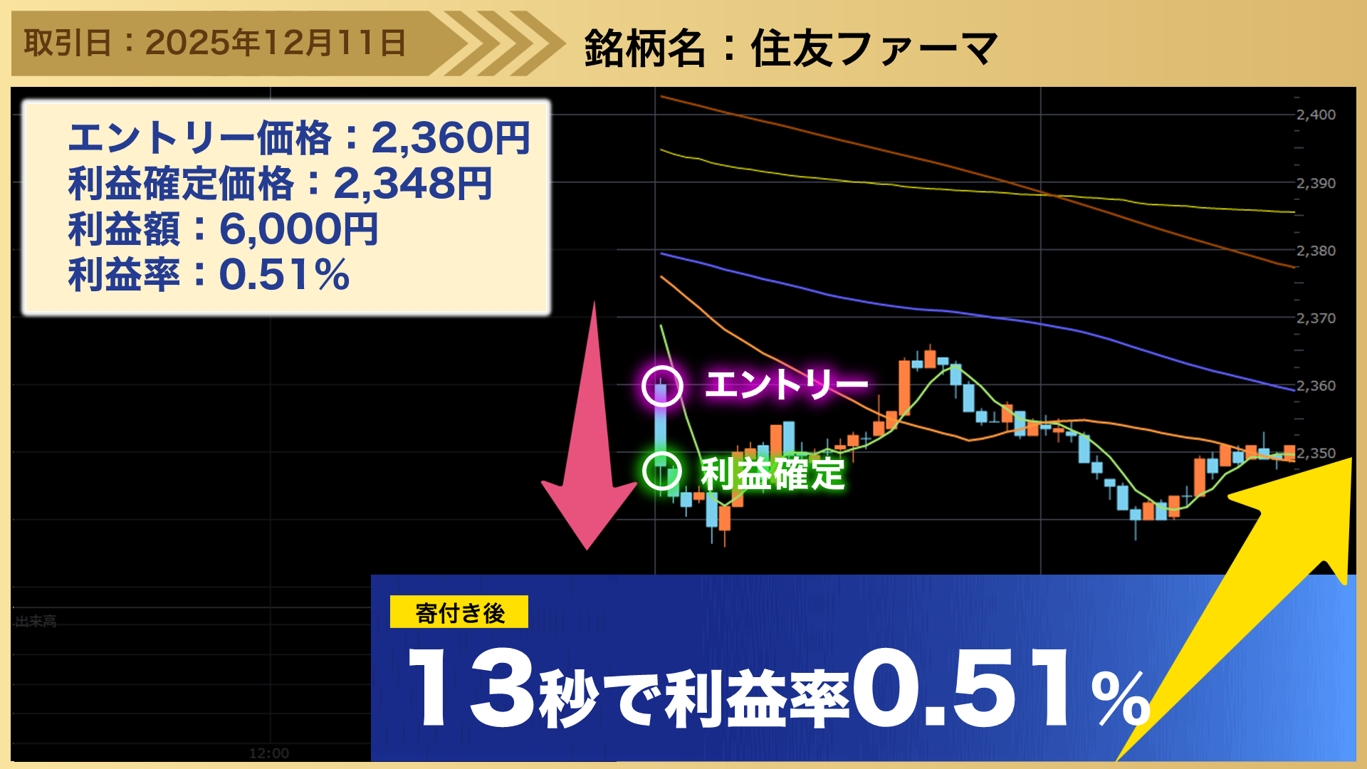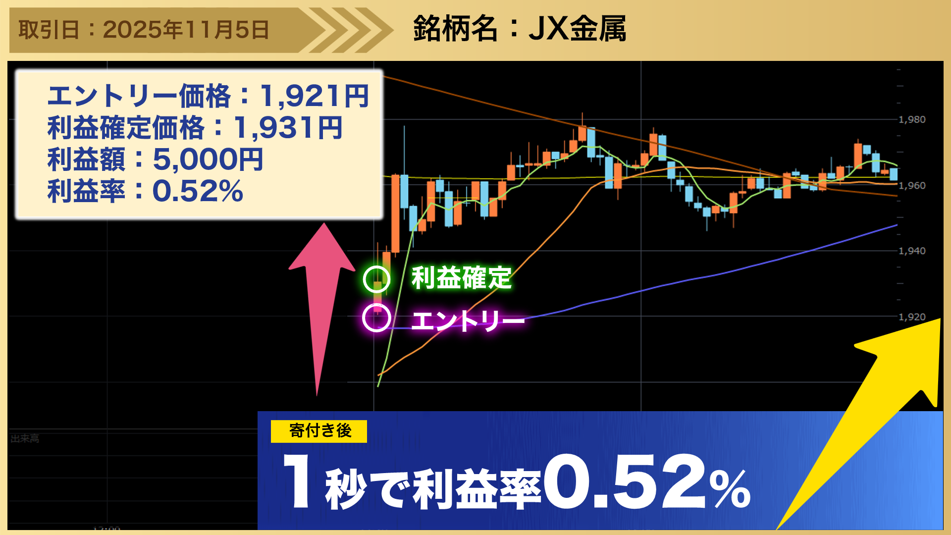 後場の居合抜き1分トレードのトレード事例として、